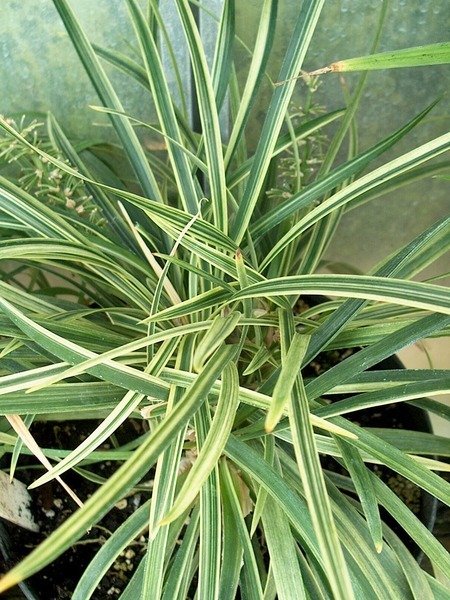 trsnatě uspořádán; úzký až čárkovitý list 30-50 x 0,5-0,8 cm, obloukovitý, kožovitý; sytě zelený, v kultivarech bíle nebo žlutě panašovaný