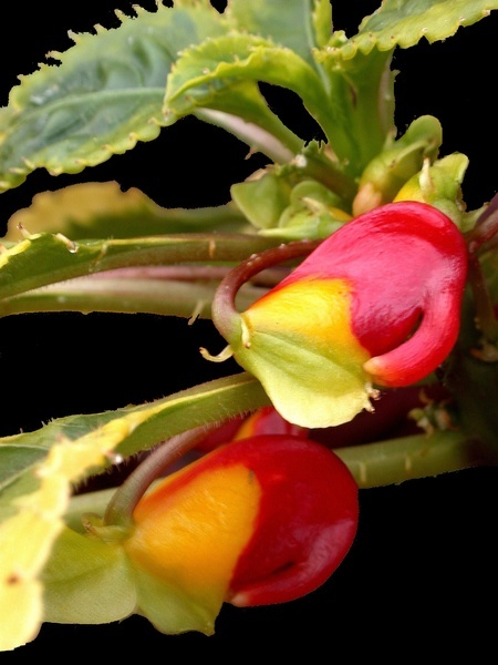 ´African King´ s květy zcela červenými, variegátní ´Golden Cockatoo´