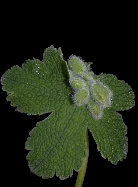 - přízemní v přezimujících růžicích, v obrysu ledvinité, dlanitodílné v 5-7 obtrojúhlých, hrubě, ale tupě zubatých segmentů, shora nežláznatě pýřité, vespod hedvábitě plstnaté, svraskalé nervaturou shora vpadlou, vespod nápadně vyniklou; lodyžní zpravidla pětidílné