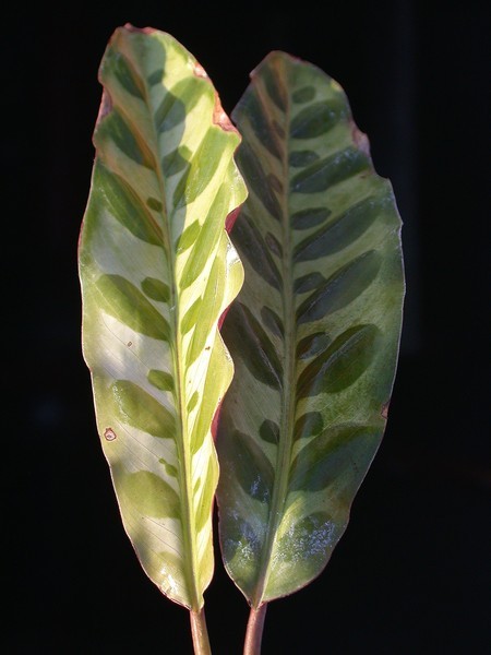 - svérázný taxon, jen stěží zaměnitelný - v listové kresbě podobné Goeppertia lancifolia (Boom) B.& S. (C.insignis Hort.) a Goeppertia wiotii (Morr.) B.& S. (listy u obou zvlněné, u první úzce kopinaté, u druhé protáhle vejčité) mají olivové skvrny na podkladě zelenavém a neprůsvitném, bez probarvené nervatury a vespod zcela purpurové