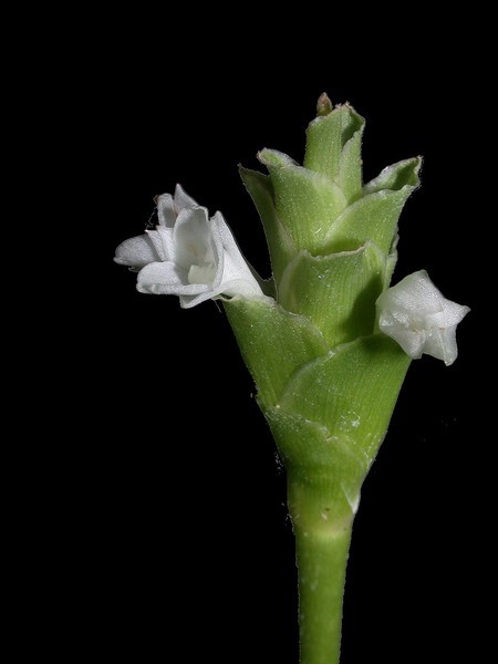 - vejčité klasy se zelenými, spirálně sestavenými listeny a asymetrickými bílými, růžově stínovanými květy se staminodiemi nápadnějšími tepalů (plodná je jen polovina jediné tyčinky)