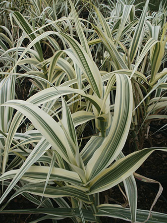 - silné olistěná, cca 2 - 3 cm tlustá stébla připomínající mambusové výhony nesou dvouřadě uspořádané listy a vytvářejí hustý porost