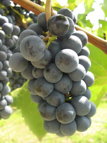 malý, hustý, válcovitý hrozen; bobule malá až středně velká, kulatá, tmavě modrá