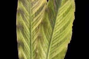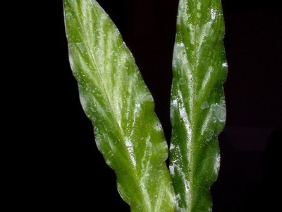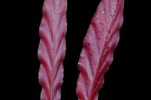 - homotropní, dlouze řapíkaté (poměr délky řapíku k čepeli proměnlivý v ontogenezi), hrotnaté, úzce kopinaté, zvlněné, asymetrické čepele až 0.3 m dlouhé, shora temně zelené, vespod purpurové, červenavě pýřité