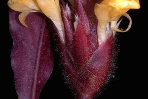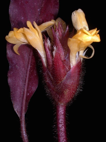 - téměř přisedlé vejčité klasy s purpurovými, žláznatě pýřitými, spirálně seskládanými listeny a žlutými květy
