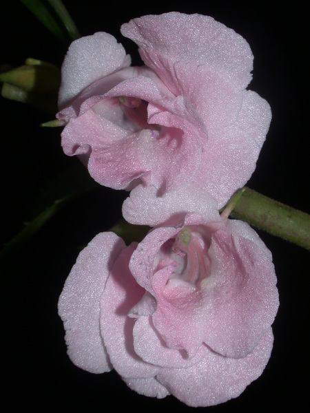 - oboupohlavné, souměrné, pětičetné (ale jen tři sepaly, spodní vybíhá v kratičkou ostruhu), rumělkové, karmínové, růžové, bílé; laterální petaly spojené a téměř shodné velikosti, dorsální veliký a obsrdčitý