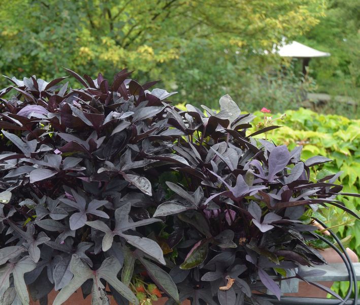 Použití převislých forem Ipomoea batatas v nádobách. Lednice, 2022. Foto: T. Kuťková.