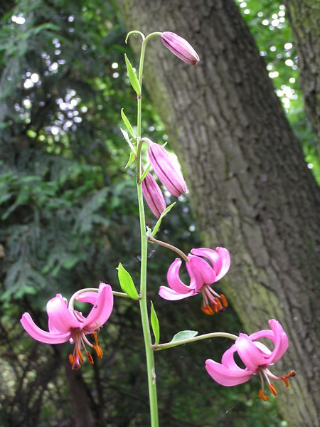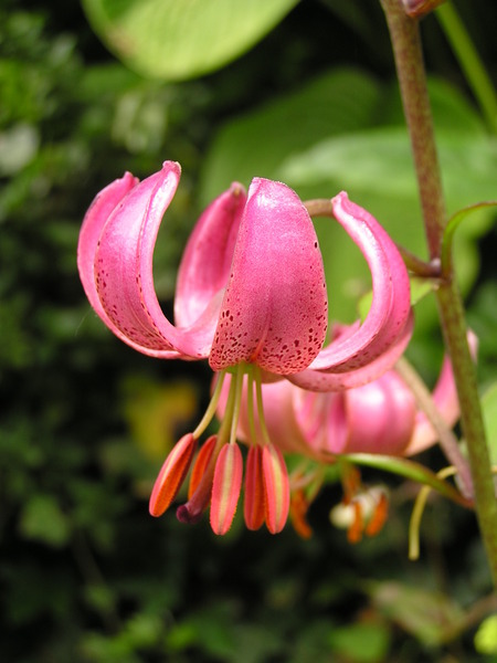 nící květy turbanovitého tvaru, Barva květů je velmi variabilní v odstínech růžové s fialovými tečkami i bez nich.
