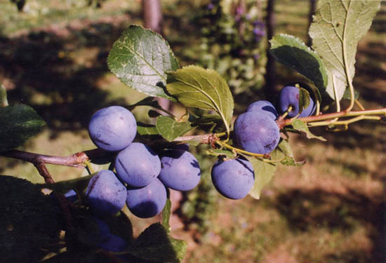 slívy, středně velké, oválné až kulovité, modrofialové, šťavnaté, velmi chutné, dužnina zlatavá až žlutohnědá, špatná odlučitelnost