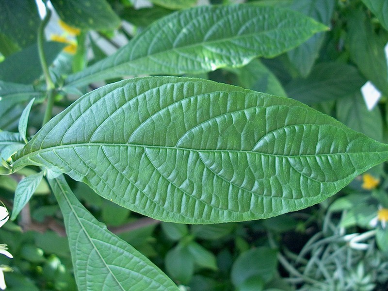 - vstřícné; dlouze kopinaté, 8-15 x 3-4 cm velké, na konci slabě zahrocené, středně až tmavě zelené s nápadnou žilnatinou, žilky svrchu zapuštěné