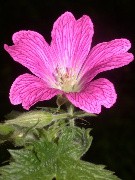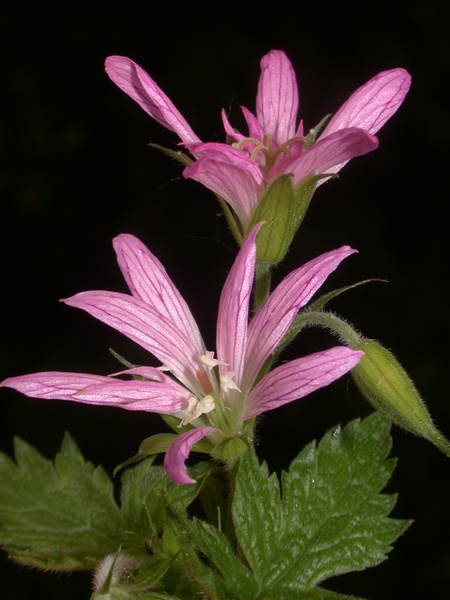 nálevkovité, různoobalné s hrotnatě osinkatými, žláznatými sepaly a širokými, často srdčitě vykrojenými petaly, volnoplátečné, pětičetné, diplostemonické, purpurové nebo růžové, obvykle s výraznou tmavou nervaturou; ve velikosti dle odrůdových dispozic silně proměnlivé