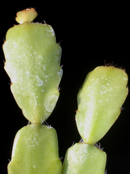 - ploché, článkovan, sytě až temně zelené, na slunci často červeně naběhlé, ostře zubaté nebo vroubkované s apikálními areolami