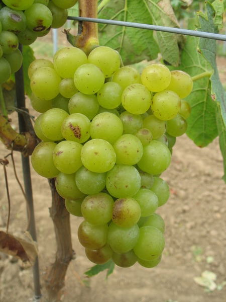- středně velký, válcovitě-kuželovitý, středně hustý až hustý hrozen; bobule je středně velká, kulatá, žlutozelená, na osluněné straně zlatavě žlutá s hnědými skvrnami