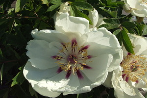 korunový, někdy anemonkovitý typ květu, 15 × 7 cm, bílé (155 - D), vnější petaly ve 2 přeslenech, velké a ploché, nepravidelně zubaté, na báze světle červeně naběhlé, vnitřní petaly svraskalé