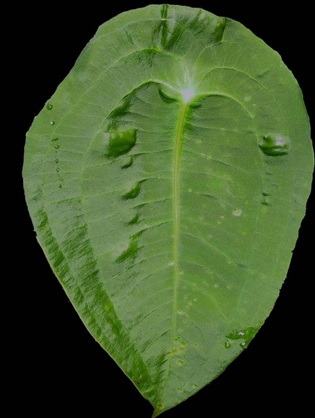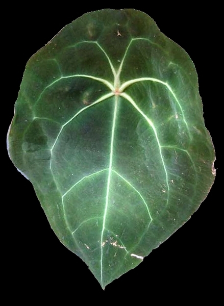 - pochvatě a kloubnatě řapíkaté (řapíky oblé!), až 0.4 m dlouhé, vejčitě srdčité s překrývajícími se laloky, temně zelené a sametově lesklé (drobné papilly) s bělavými pásy sledujícími stejně zbarvenou nervaturu