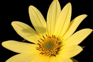 - úbory s 12-20 bledě žlutými paprsky, šedesáti nebo více kvítky disku a zákrovem z 20-25 lineárních, nežláznatých, abaxiálně štětinkatých listenů s brvitými okraji
