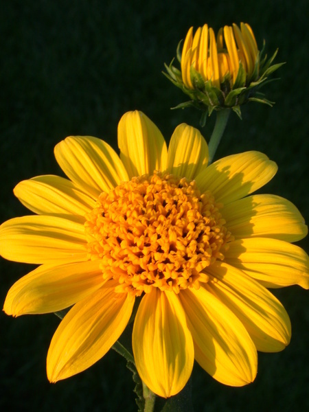 - úbory až 0.1 m veliké, s 25-35 (u plných odrůd i značně více) žlutými paprsky kol disku 30-40 mm širokého, chráněné zákrovem kopinatých, zelených, odstálých listenů