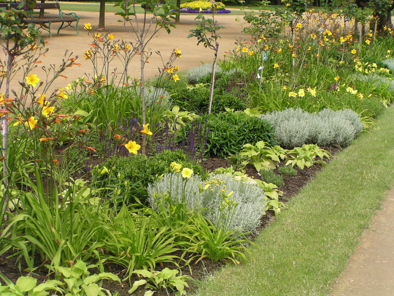 Trvalková výsadba záhonového charakteru se Santolina chamaecyparissus mulčovaná štěrkem
