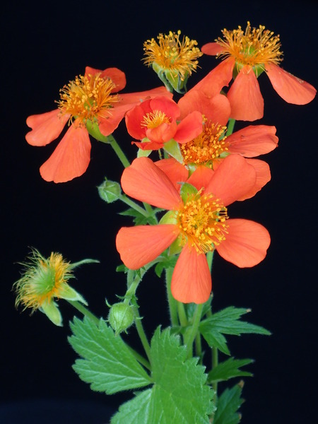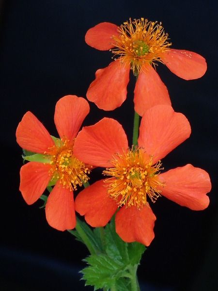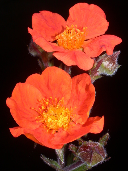 - oboupohlavné, různoobalné, pravidelně pětičetné, s trojúhlými, po rozkvětu nazpět skloněnými, pýřitými sepaly střídanými s drobnými lístky kalíšků, koruny rozevřené, zhruba 3 cm široké s petaly mělce obsrdčitými a rumělkově červenými, tyčinky se žlutými prašníky jsou početné, podobně i pestíky s čnělkami prodlužujícími se po odkvětu