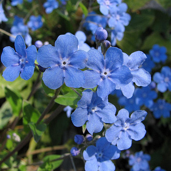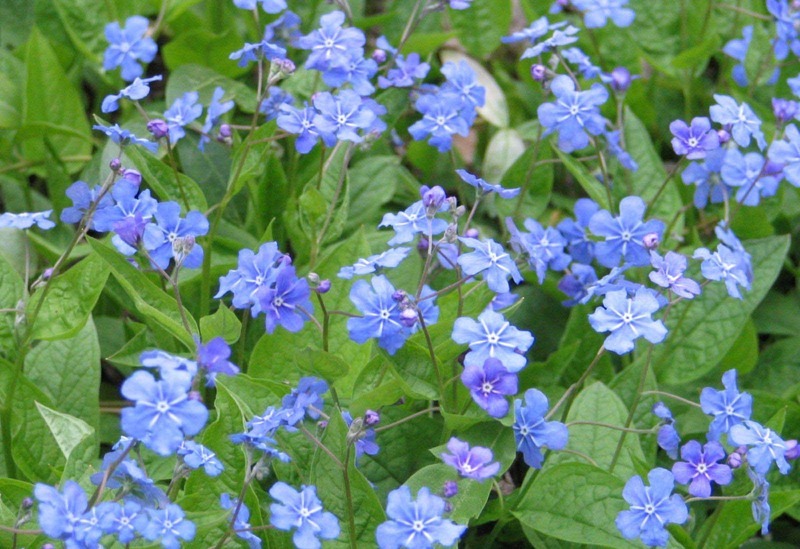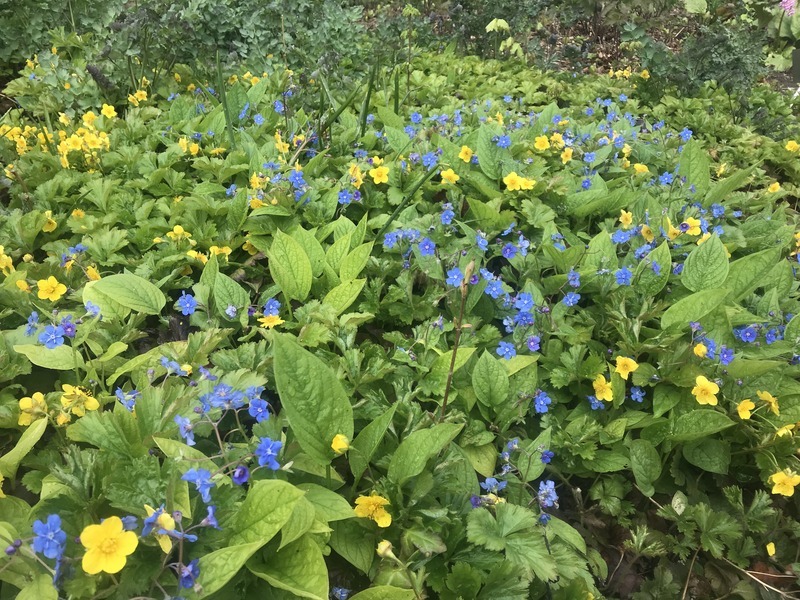 Omphalodes verna a Waldsteinia ternata v pokryvné výsadbě brzy na jaře.
