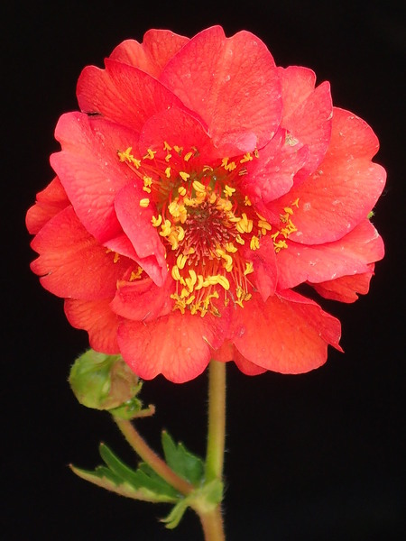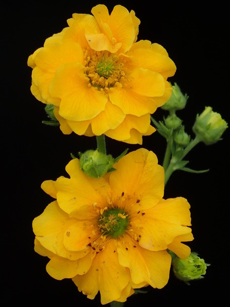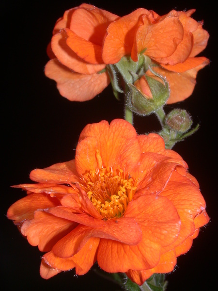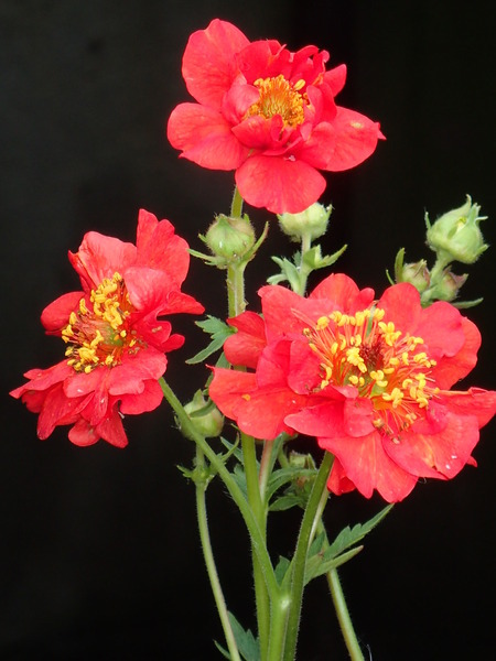 - oboupohlavné, různoobalné, pravidelně pětičetné, s trojúhlými, po rozkvětu nazpět skloněnými, pýřitými sepaly střídanými s drobnými lístky kalíšků, koruny rozevřené, zhruba 5 cm široké se zvlněnými, srdčitě vykrojenými, rumělkově červenými (u odrůd i rubínovými nebo žlutými a často pomnoženými) petaly, tyčinky se žlutými prašníky jsou početné, podobně i pestíky s čnělkami prodlužujícími se po odkvětu