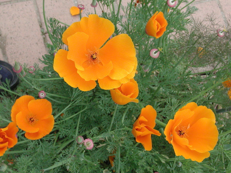 Eschscholtzia californica ve víceletém štěrkovém záhonu. Ledenice, 2020.