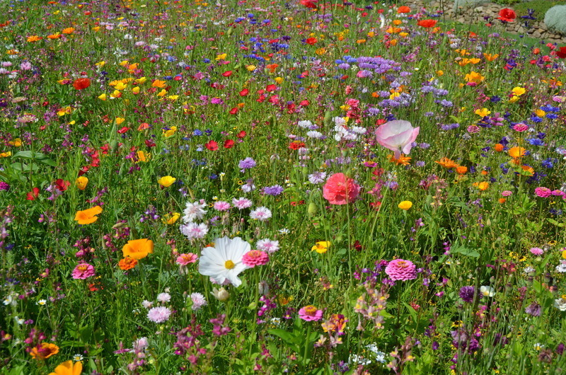 Eschscholtzia californica ve směsi Strakonická louka na záhonu založeném přímým výsevem. Lednice, 2018.