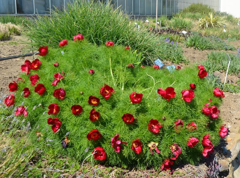- květy tmavě červené, jednoduché, 6 -8 cm velké s nápadnými žlutými tyčinkami