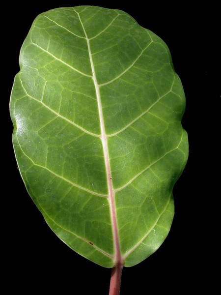 - Vejčitě elipčité, až 0.3 m dlouhé se silnými řapíky; temně zelené, oboustranně lysé s výraznou, bledou, bělavě chloupkatou primární nervaturou (vybíhající z žebra nanejvýš v šesti párech), kožovité, s bazálními voskodárnými žlázkami; palisty pýřité, opadavé