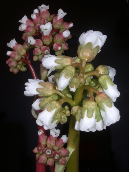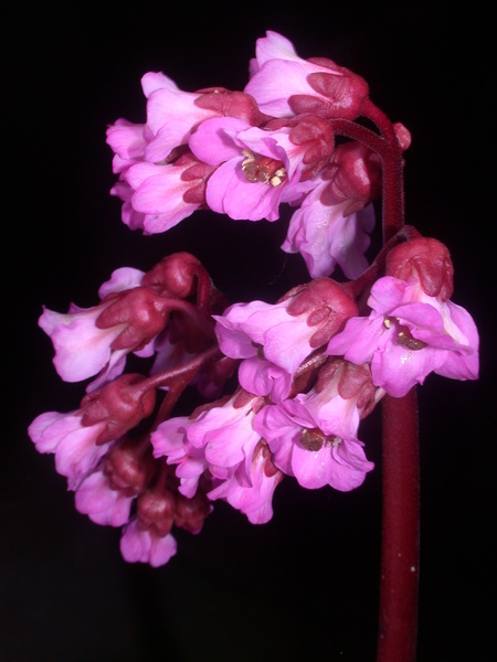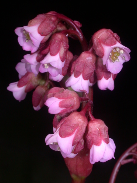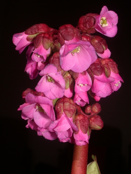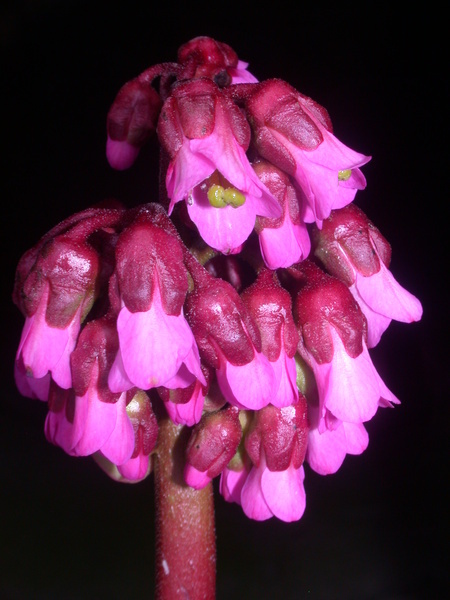 - odrůdy se vzhledem blíží jednomu či druhému z rodičovských druhů: liší se od B. crassifolia latami často žláznatými s květy více poniklými a zvonkovitě staženými, od B. purpurascens širšími, téměř okrouhlými listy a početnějšími květy