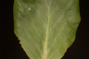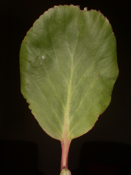 - obvejčitě elipčité, masitě kožovité, lysé, často hodně přes 0.1 m široké, se zvlněně zoubkatými a brvitými okraji, v zimě často purpurové, řapíky silné a pochvaté