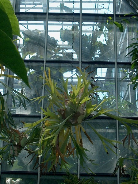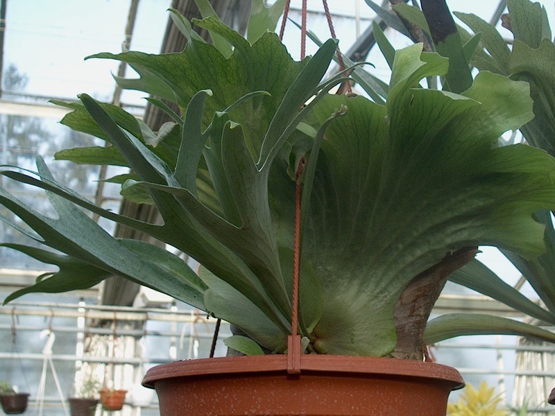 - výrazná heterofylie; fertilní listy (sporofyly) dorůstají 70-100 cm délky, jsou 2-3 x vidličnatě větvené (parohovité), laločnaté (laloky cca 10x4 cm), u báze vzpřímené, laloky převisajicí; na rubu se souvislými plochami (výtrusná políčka) tmavě hnědých výtrusnicových kupek; sterilní listy (trofofyly) mají okrouhlý až ledvinitý tvar, cca 20-30 cm v průměru, jsou pevně přichyceny na kmenu stromu, okraj zvlněný; mladé listy stříbřitě našedlé; neodstraňovat odumřelé trofofyly, zabezpečují výživu rostliny