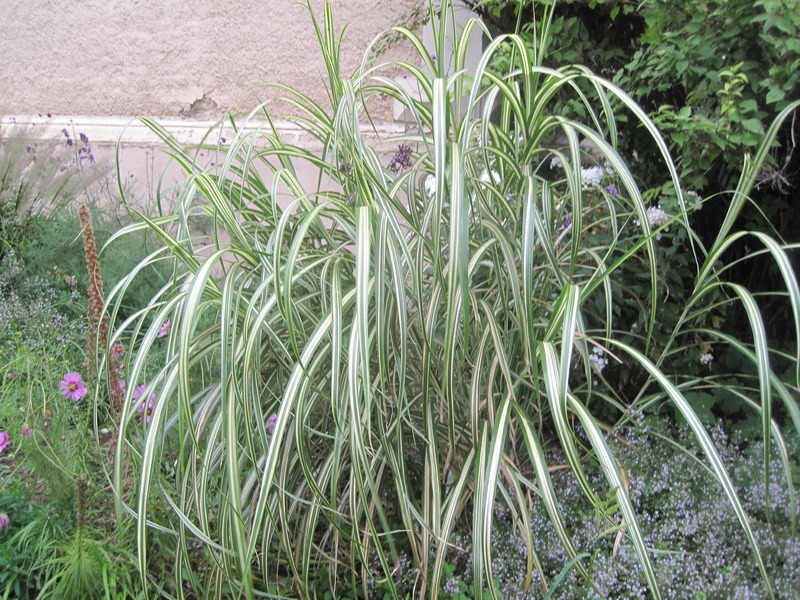 - stébelnatá tráva s krátkými oddenky, tvoří hustý trs listů; středně vysoký variegátní, širokolistý kultivar, v listu vysoký přibližně 80 - 100 cm, v květu 150 - 180 cm