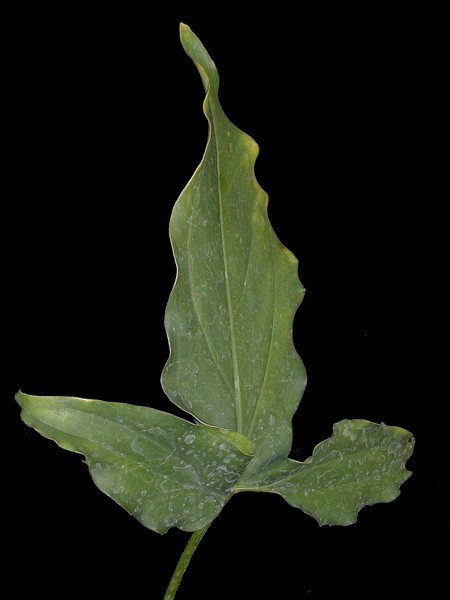 - pochvatě řapíkaté, matně olivově zelené, zprvu srdčité, později ouškatě střelovité s nervaturou při okraji sbíhavou, na adultních rostlinách listy robustní a znožené v 7-9 segmentů