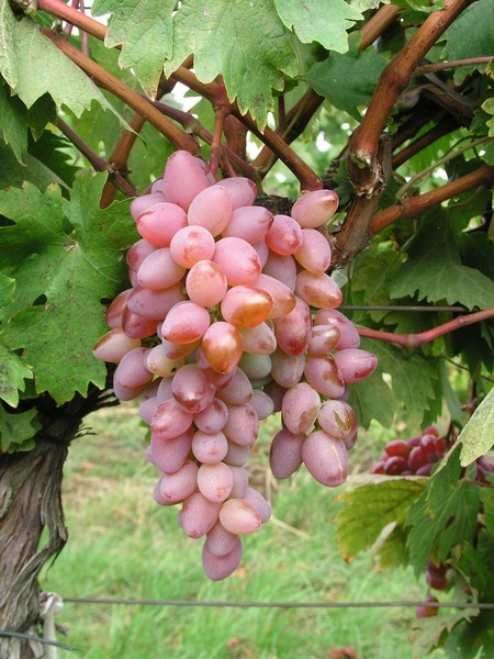 velký, kuželovitý, středně hustý až řidší hrozen; bobule je velmi velká, vejcovitá, růžovofialové barvy
