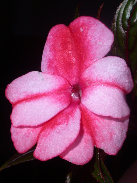 oboupohlavné, souměrné, velikosti dětské dlaně s pěti rozměrnými, srdčitě vykrojenými, ploše seskládanými petaly a dlouhou tenkou ostruhou, v šarlatových, purpurových, růžových a bílých odstínech