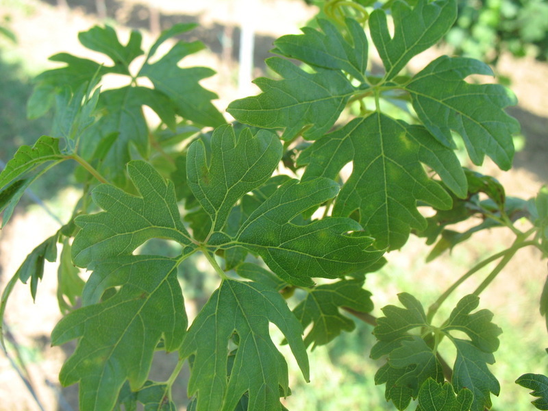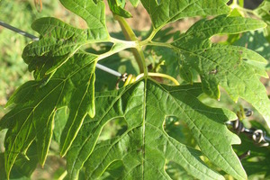 - středně velké, nápadně polostříhané, výrazně a hluboce vykrajované, řapíkový výkrojek je otevřený, všech pět hlavních nervů je holých, bez listové čepele; povrch listu jemně vrásčitý