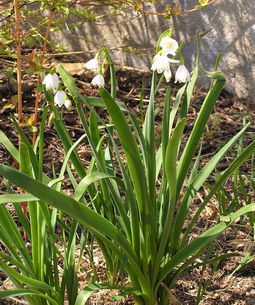 Leucojum aestivum ´Gravetye Giant´- cibule vlevo a Leucojum aestivum botanický druh vpravo . Foto: S. Vilím.