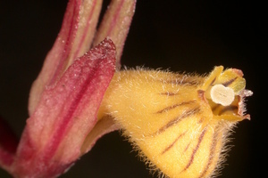 - oboupohlavné, břichatě souměrné, různoobalné, srostloplátečné s nafouklou korunní trubkou, pýřité, žluté s kaštanovým proužkováním, se silně redukovanými korunními cípy, pětičetné, resupinátní