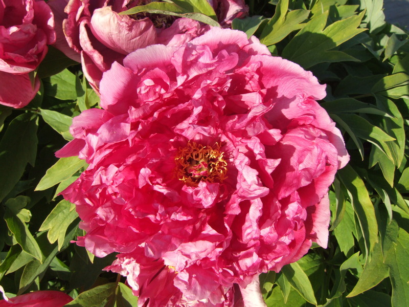 poloplné, petaly svetle červeně růžově zbarvené, dovnitř zahlé, vrcholek zubatý, květy v průměru cca 15 cm